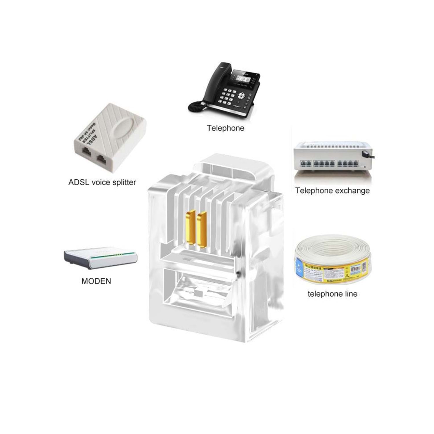 NBTech NB-6P2C RJ11 2 pinli konnektör, RJ11 Jack, 6P2C Jack, RJ11 Telefon Kablo Ucu 100 lü Paket