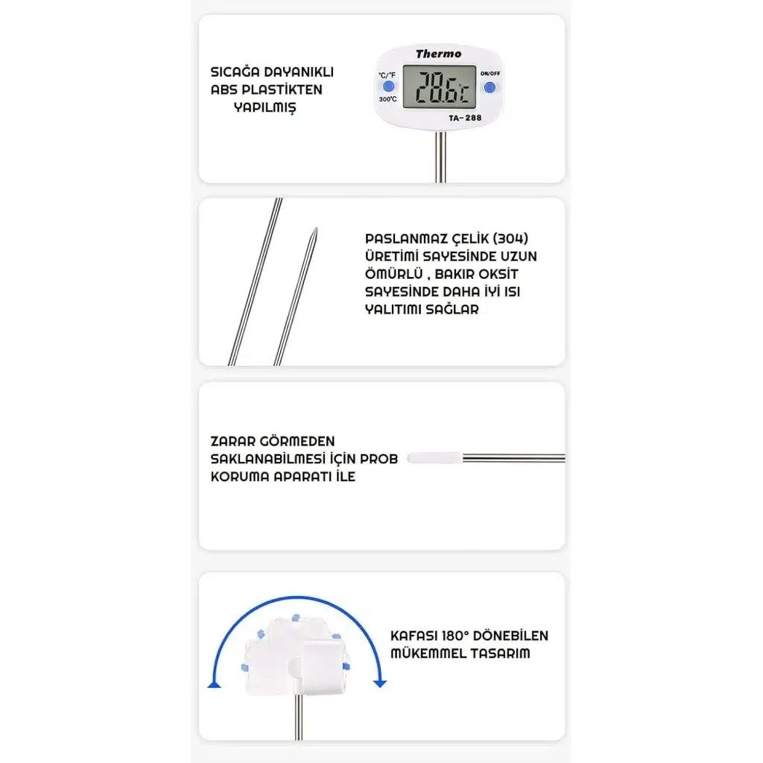 Teknik Özellikler: Renk : Beyaz Prob uzunluğu: 150mm Başlık uzunluğu : 44mm Malzeme : Paslanmaz çelik prob, abs plastik gövde Ölçüm aralığı: -50 ℃ -300℃ Ekran : Dijital ekran