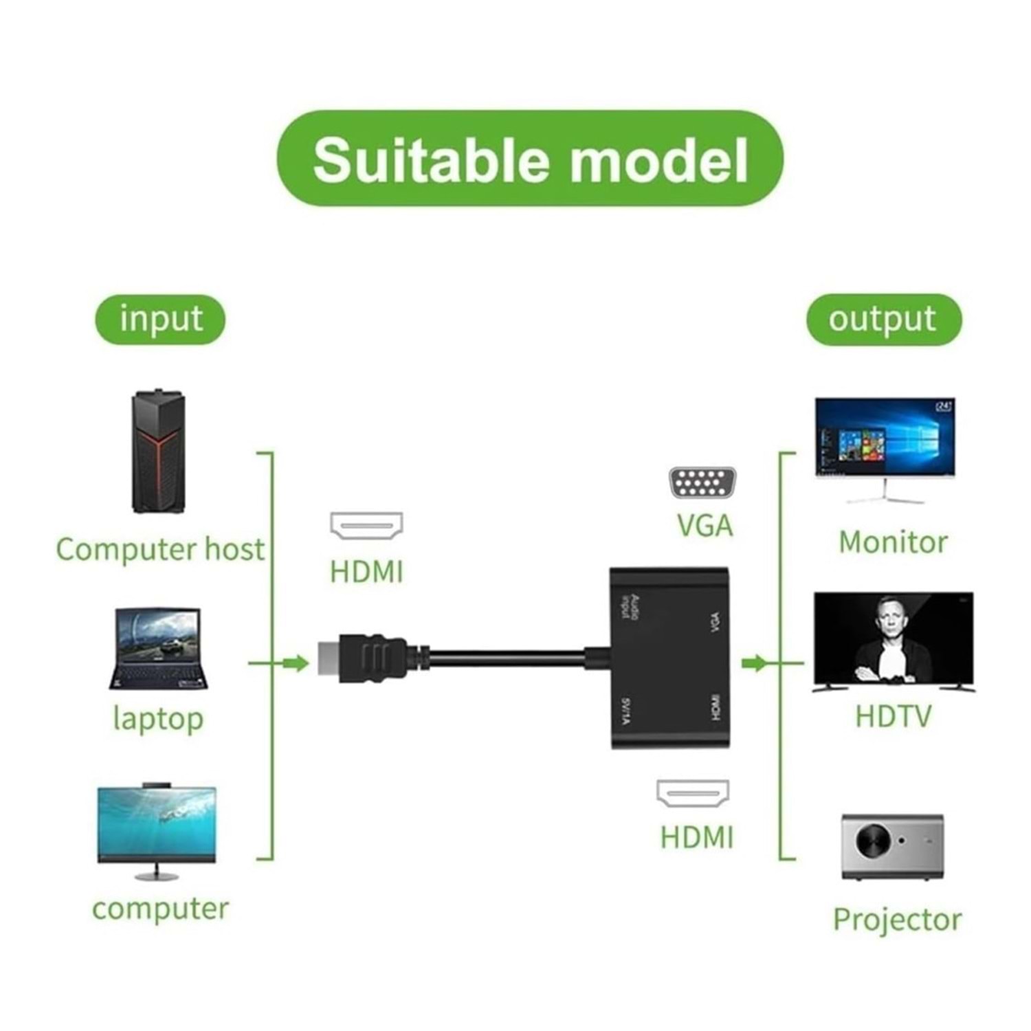 - HDMI to VGA Adaptörü, çeşitli kullanım senaryoları için mükemmel bir çözüm sunar: ofiste sunumlar yapmak, evde film izlemek veya seyahatlerde cihazlarınızı büyük ekranlara bağlamak için idealdir.