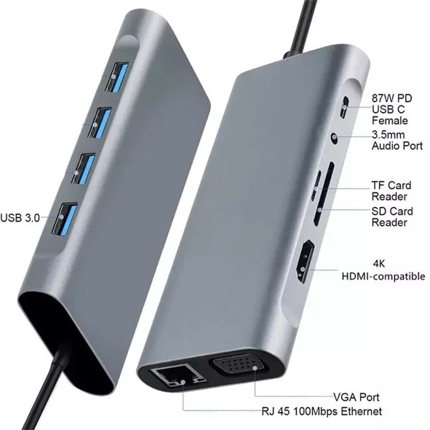 11 in 1 USB C HUB tipi C adaptörü için 4K HD VGA RJ45 Lan Ethernet SD/TF hub 3.5MM AUX 11 Port dok istasyonu PC dizüstü Splitter