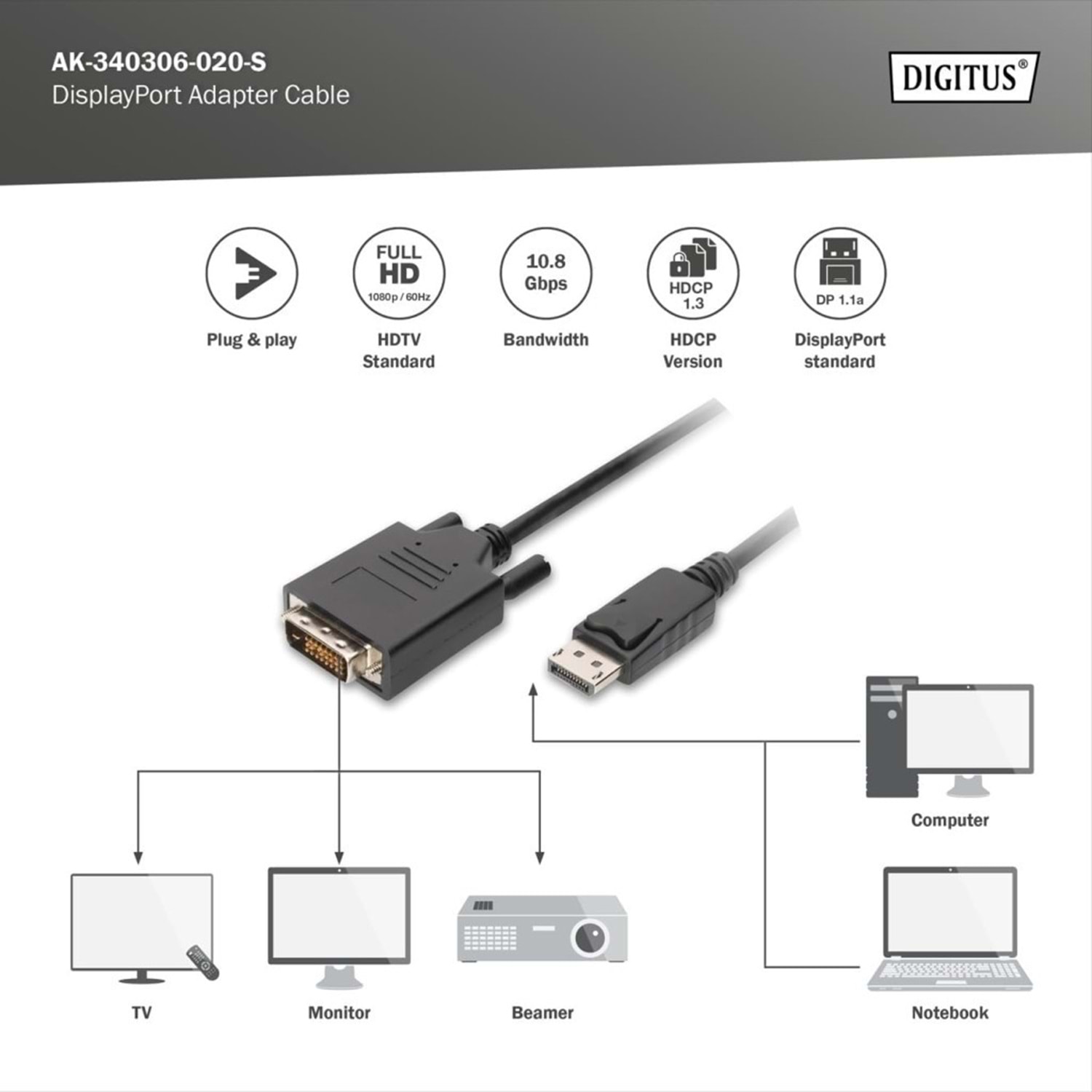 Digitus AK-340306-020-S Rev.2 2 Metre Display Port DVI Kablosu, DP Erkek DVI Kablo